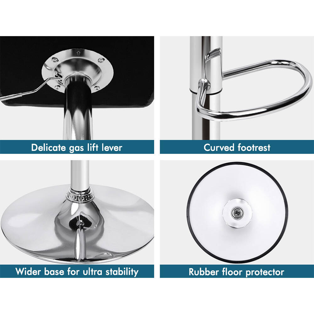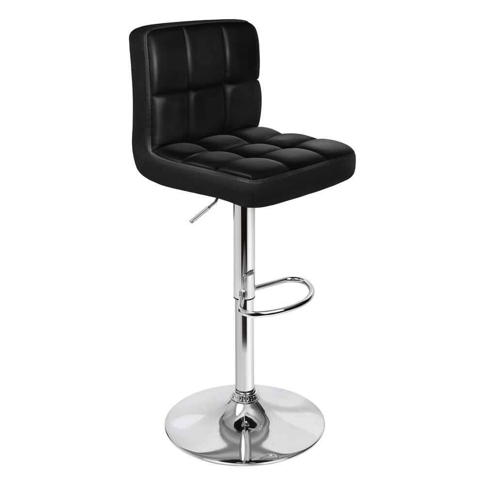 Upholstered in premium PU leather, the seat and backrest are richly padded with high-resilience foam. It presents a 360-degree swivel and adjustable seat height. The shiny chrome base and footrest complement the stool's modern design. A rubber floor protector ring reduces noise and protects your floor.
