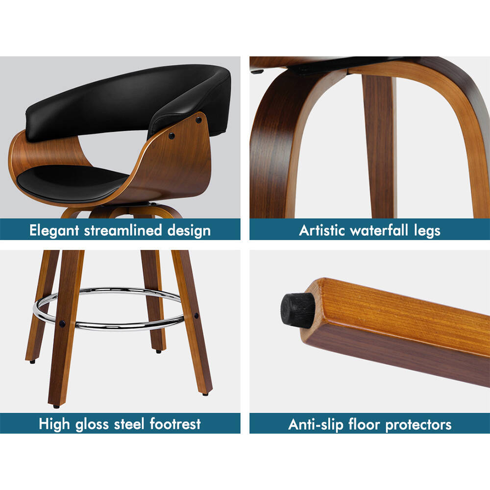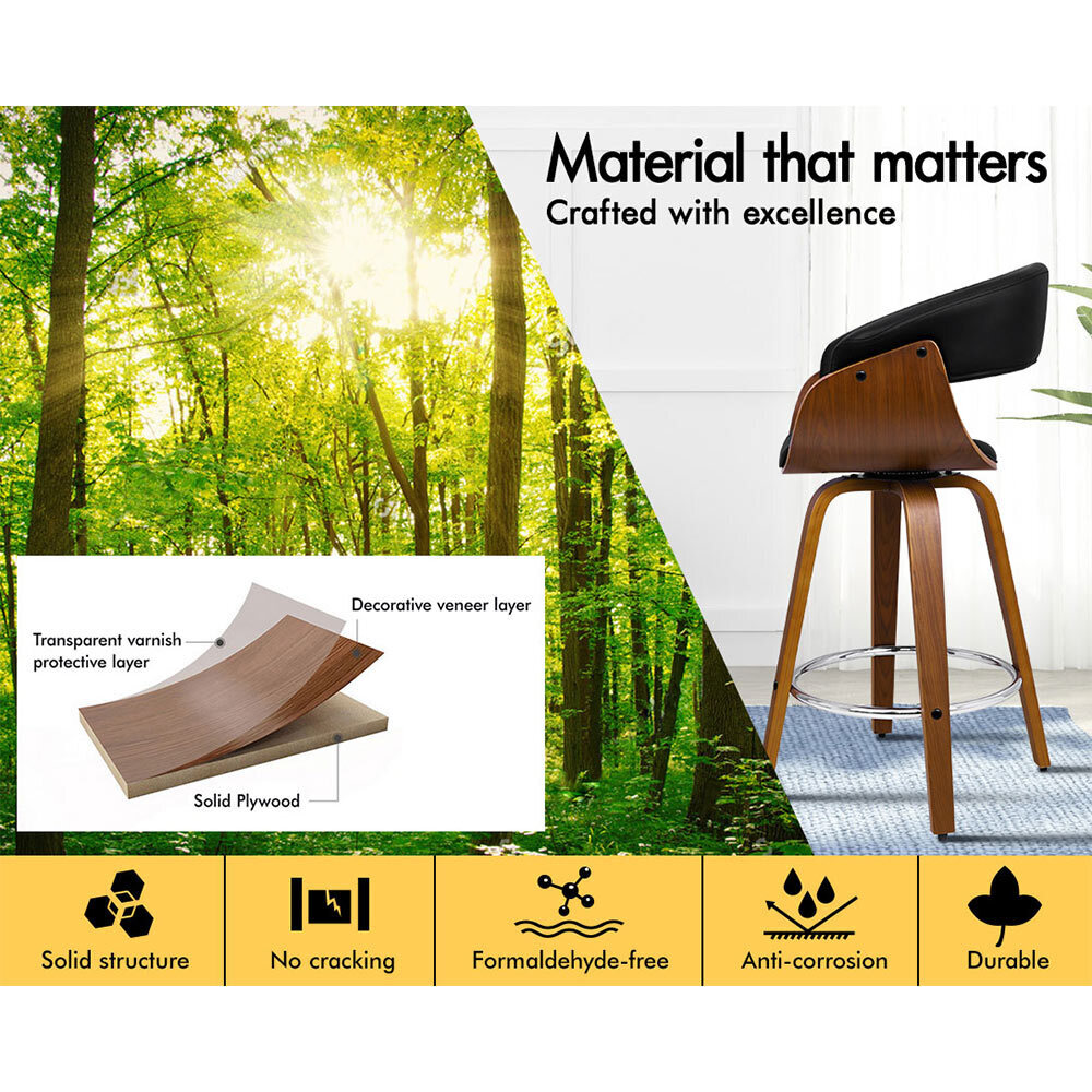 Upholstered in premium PU leather, the seat and backrest are richly padded with high-resilience foam and comfortable. Enhanced wooden base, made of solid plywood, ensures ultra stability with long-lasting durability. Your floor is also aptly protected with anti-slip plastic floor protectors attached to each leg of the bar stool.