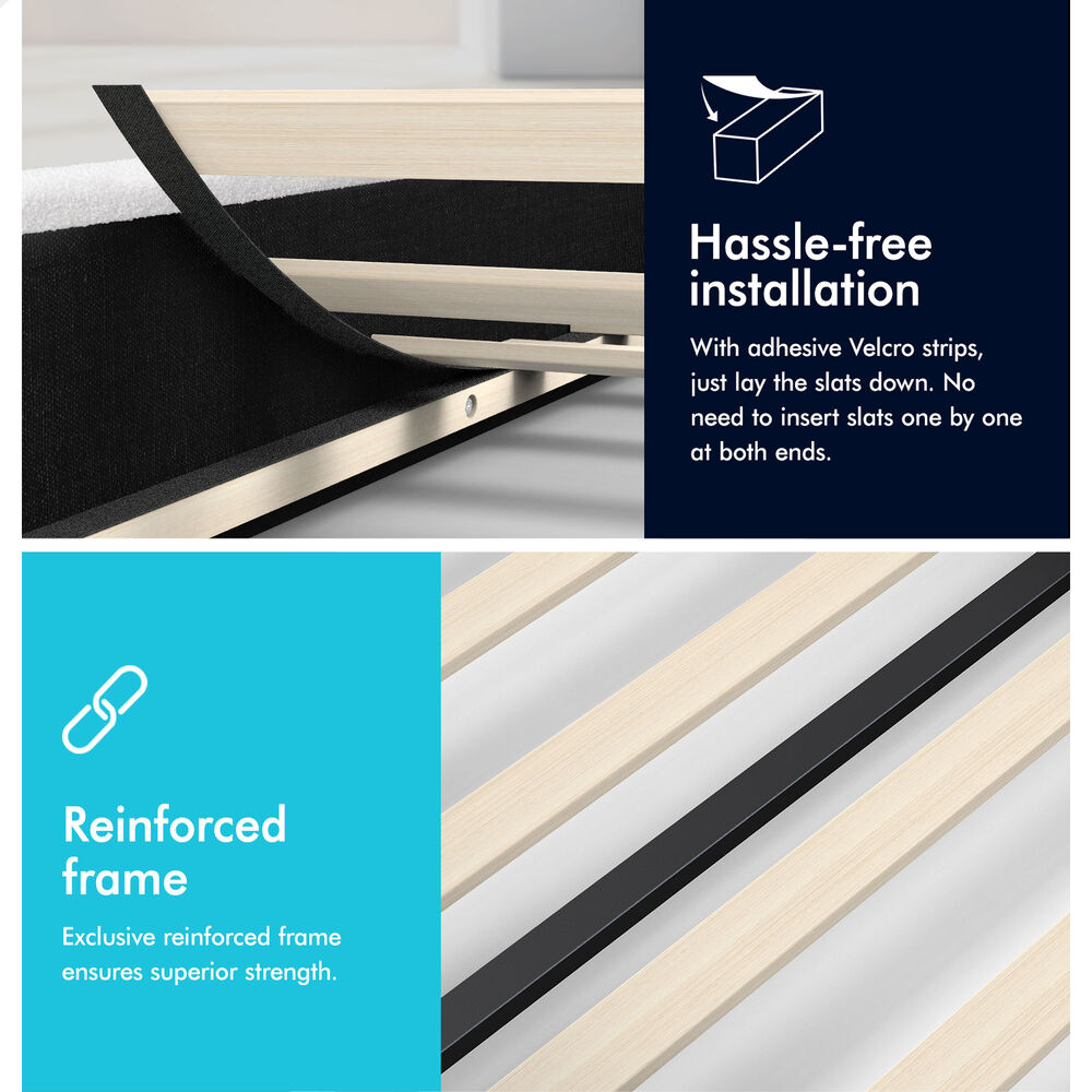 Quality counts - Constructed of durable wood slats and reinforced with reinforced frame, this bed frame provides you with full sense of security. What's more, with adhesive Velcro strips, you can just lay the slats down, without inserting slats one by one at both end caps. Enjoy hassle-free installation!