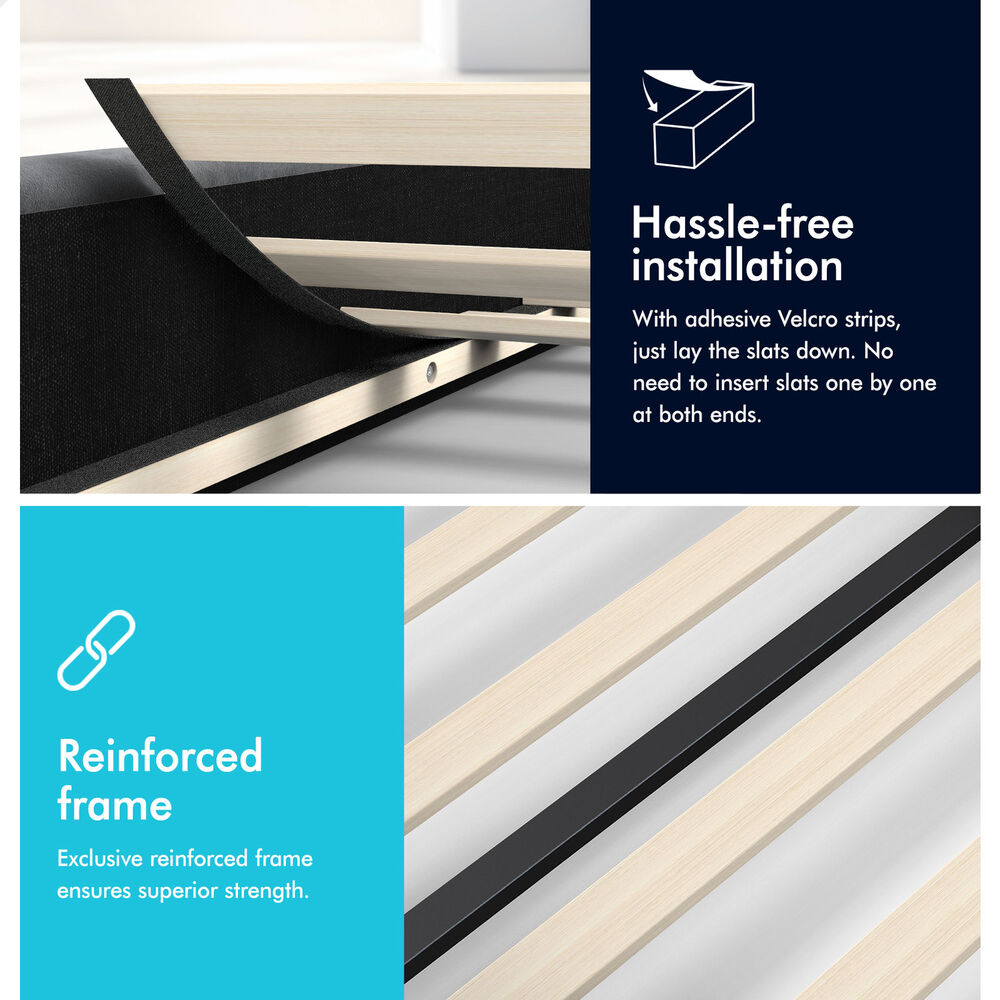 Quality counts - Constructed of durable wood slats and reinforced with reinforced frame, this bed frame provides you with full sense of security. What's more, with adhesive Velcro strips, you can just lay the slats down, without inserting slats one by one at both end caps. Enjoy hassle-free installation!