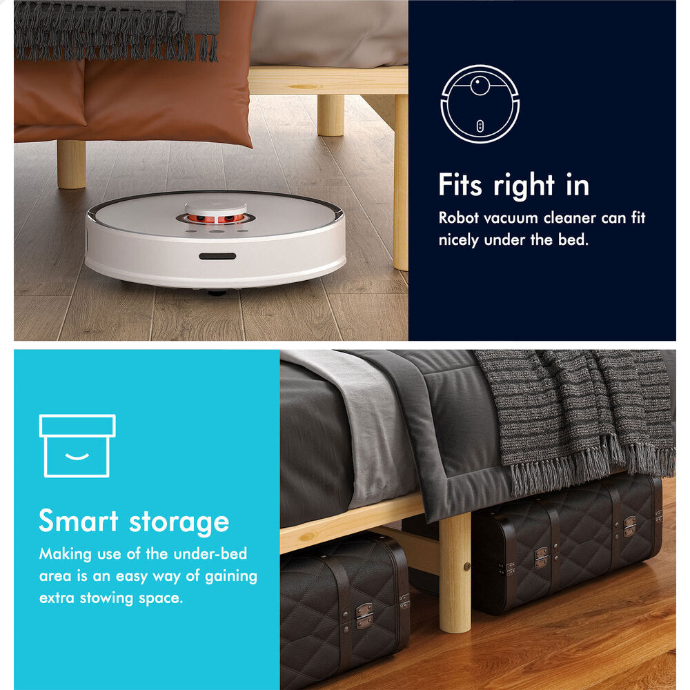 More storage place - The elevating design not only allows robot vacuum cleaner to go through under the bed, but also provides you with an additional storage space so that you can keep clothes, bedding, linen and more within reach.