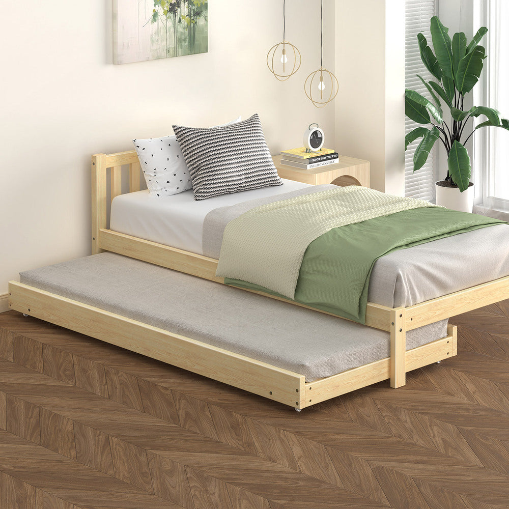 Maximize space - Our trundle bed is a two-in-one furniture piece in space-saving design. The pop-up trundle easily stores under the bed and wheels out and up when needed, without occupying the permanent floor space of two beds.
