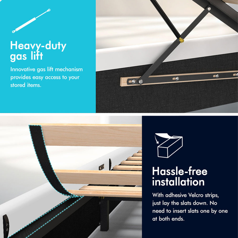 Quality counts - Constructed of durable wood slats and reinforced with exclusive X-support frame, this bed frame provides you with full sense of security. The heavy-duty gas lift mechanism allows you to effortlessly raise the mattress platform, providing easy access to the storage compartment. What's more, with adhesive Velcro strips, you can just lay the slats down, without inserting slats one by one at both end caps. Enjoy hassle-free installation!