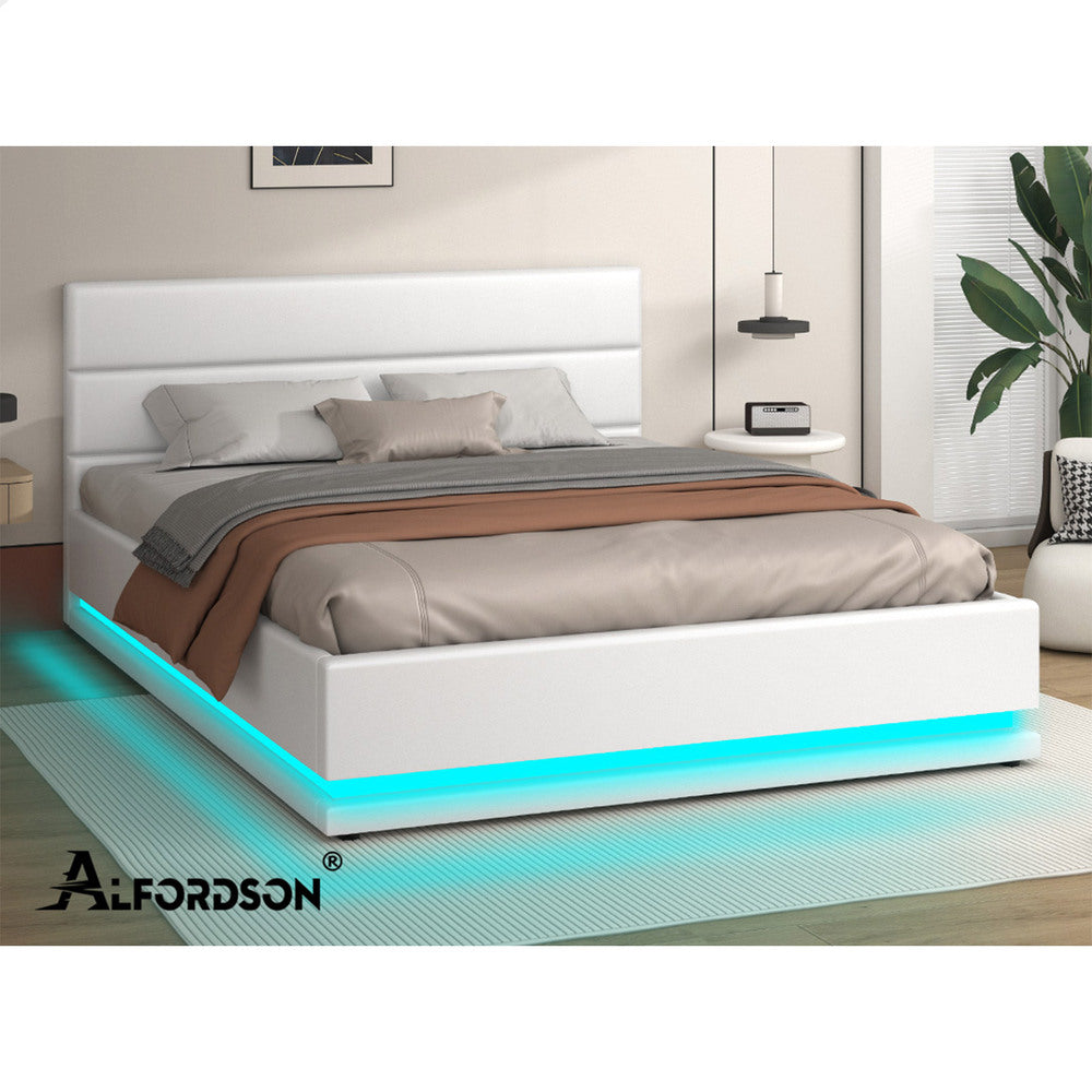 ALFORDSON Bed Frame Queen Size Platform RGB LED Gas Lift Base Storage White