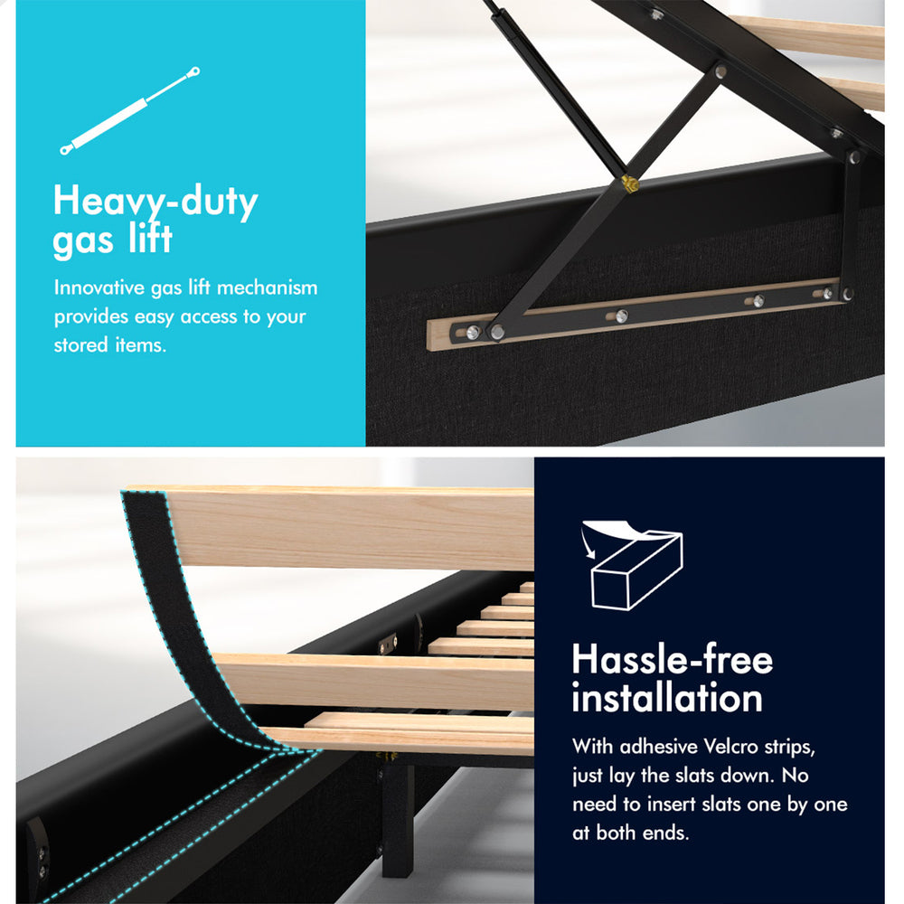 Quality counts - Constructed of durable wood slats and reinforced with exclusive X-support frame, this bed frame provides you with full sense of security. The heavy-duty gas lift mechanism allows you to effortlessly raise the mattress platform, providing easy access to the storage compartment. What's more, with adhesive Velcro strips, you can just lay the slats down, without inserting slats one by one at both end caps. Enjoy hassle-free installation!
