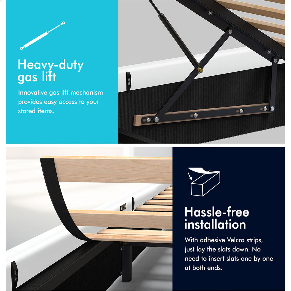 Quality counts - Constructed of durable wood slats and reinforced with exclusive X-support frame, this bed frame provides you with full sense of security. The heavy-duty gas lift mechanism allows you to effortlessly raise the mattress platform, providing easy access to the storage compartment. What's more, with adhesive Velcro strips, you can just lay the slats down, without inserting slats one by one at both end caps. Enjoy hassle-free installation!