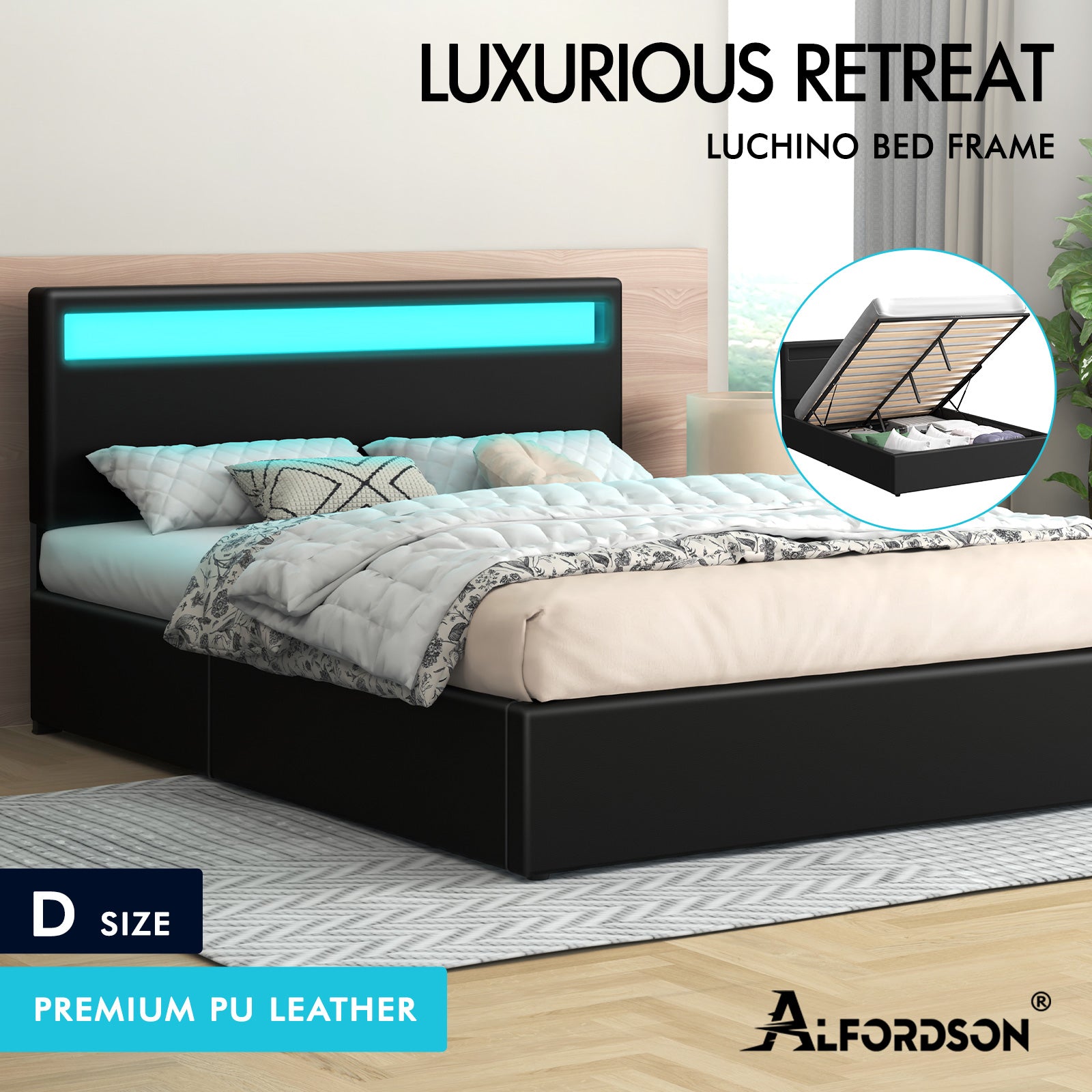 ALFORDSON Bed Frame Double Size RGB LED Gas Lift Storage Base Black LUCHINO