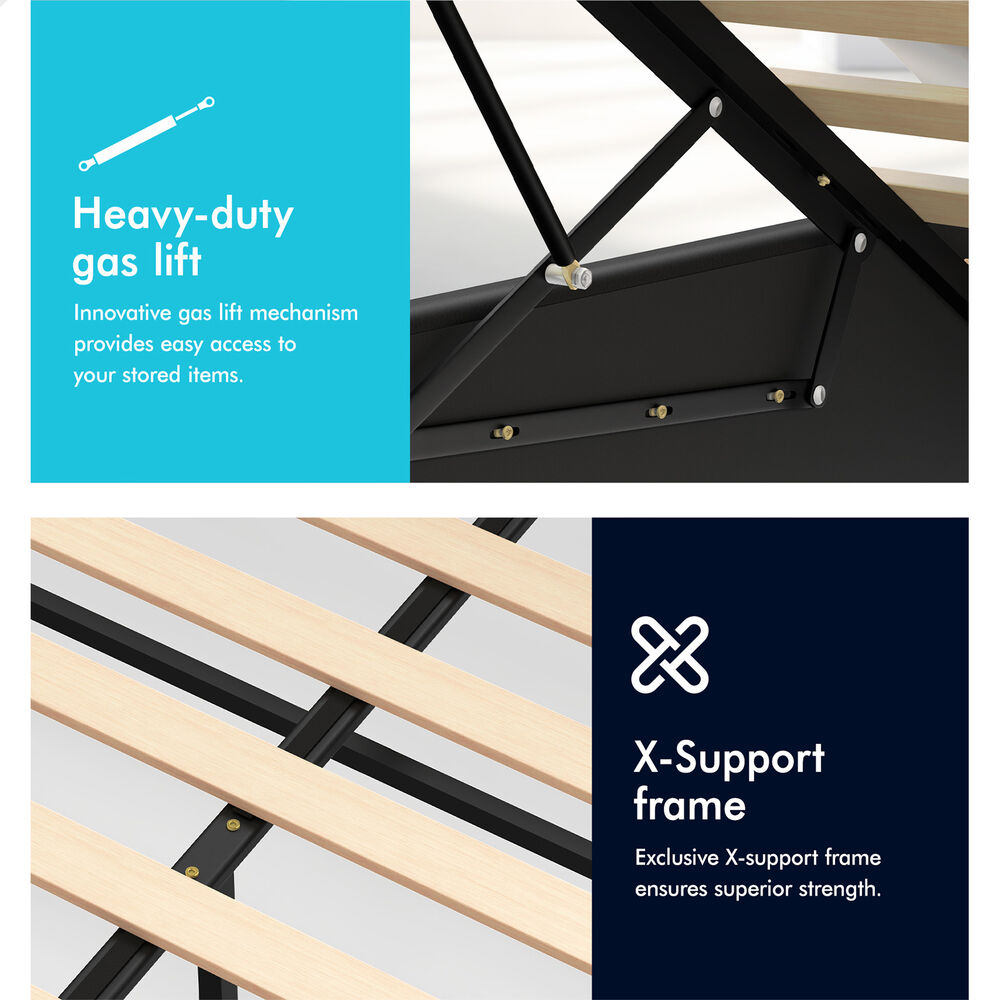 Quality counts - Constructed of durable wood slats and reinforced with exclusive X-support frame, this bed frame provides you with full sense of security. The heavy-duty gas lift mechanism allows you to effortlessly raise the mattress platform, providing easy access to the storage compartment. What's more, with adhesive Velcro strips, you can just lay the slats down, without inserting slats one by one at both end caps. Enjoy hassle-free installation!