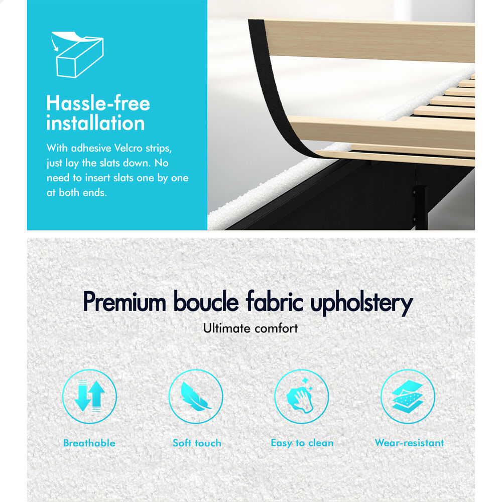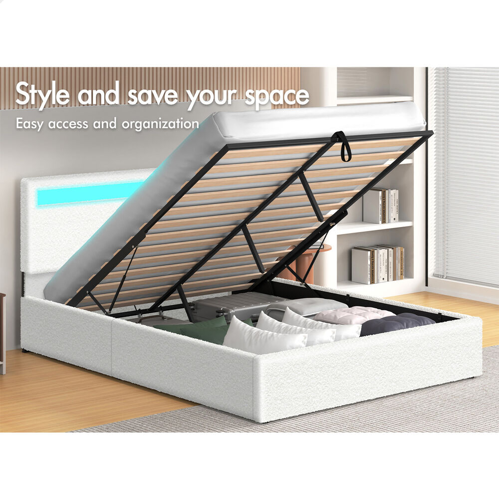 ALFORDSON Bed Frame Queen Size RGB LED Gas Lift Storage Base Boucle LUCHINO