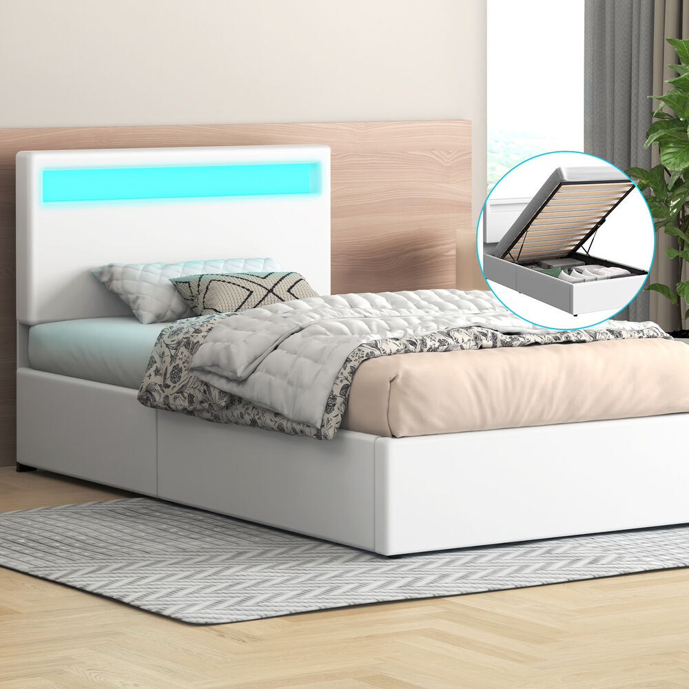 ALFORDSON Bed Frame Single Size RGB LED Gas Lift Storage Base White LUCHINO