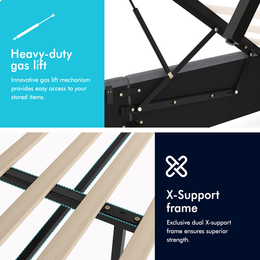 Quality counts - Constructed of durable wood slats and reinforced with exclusive X-support frame, this bed frame provides you with full sense of security. The heavy-duty gas lift mechanism allows you to effortlessly raise the mattress platform, providing easy access to the storage compartment. What's more, with adhesive Velcro strips, you can just lay the slats down, without inserting slats one by one at both end caps. Enjoy hassle-free installation!
