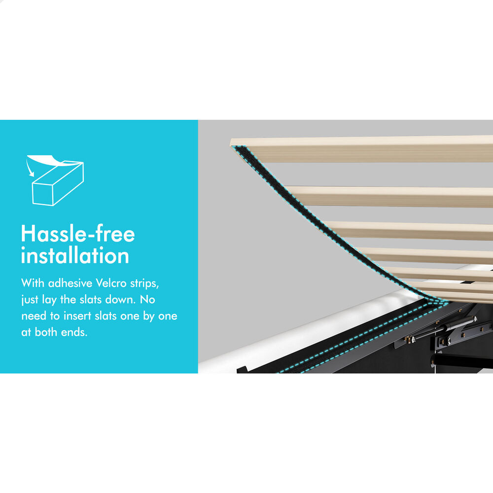Quality counts - Constructed of durable wood slats and reinforced with exclusive X-support frame, this bed frame provides you with full sense of security. The heavy-duty gas lift mechanism allows you to effortlessly raise the mattress platform, providing easy access to the storage compartment. What's more, with adhesive Velcro strips, you can just lay the slats down, without inserting slats one by one at both end caps. Enjoy hassle-free installation!