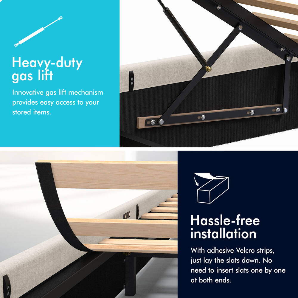 Quality counts - Constructed of durable wood slats and reinforced with exclusive X-support frame, this bed frame provides you with full sense of security. The heavy-duty gas lift mechanism allows you to effortlessly raise the mattress platform, providing easy access to the storage compartment. What's more, with adhesive Velcro strips, you can just lay the slats down, without inserting slats one by one at both end caps. Enjoy hassle-free installation!