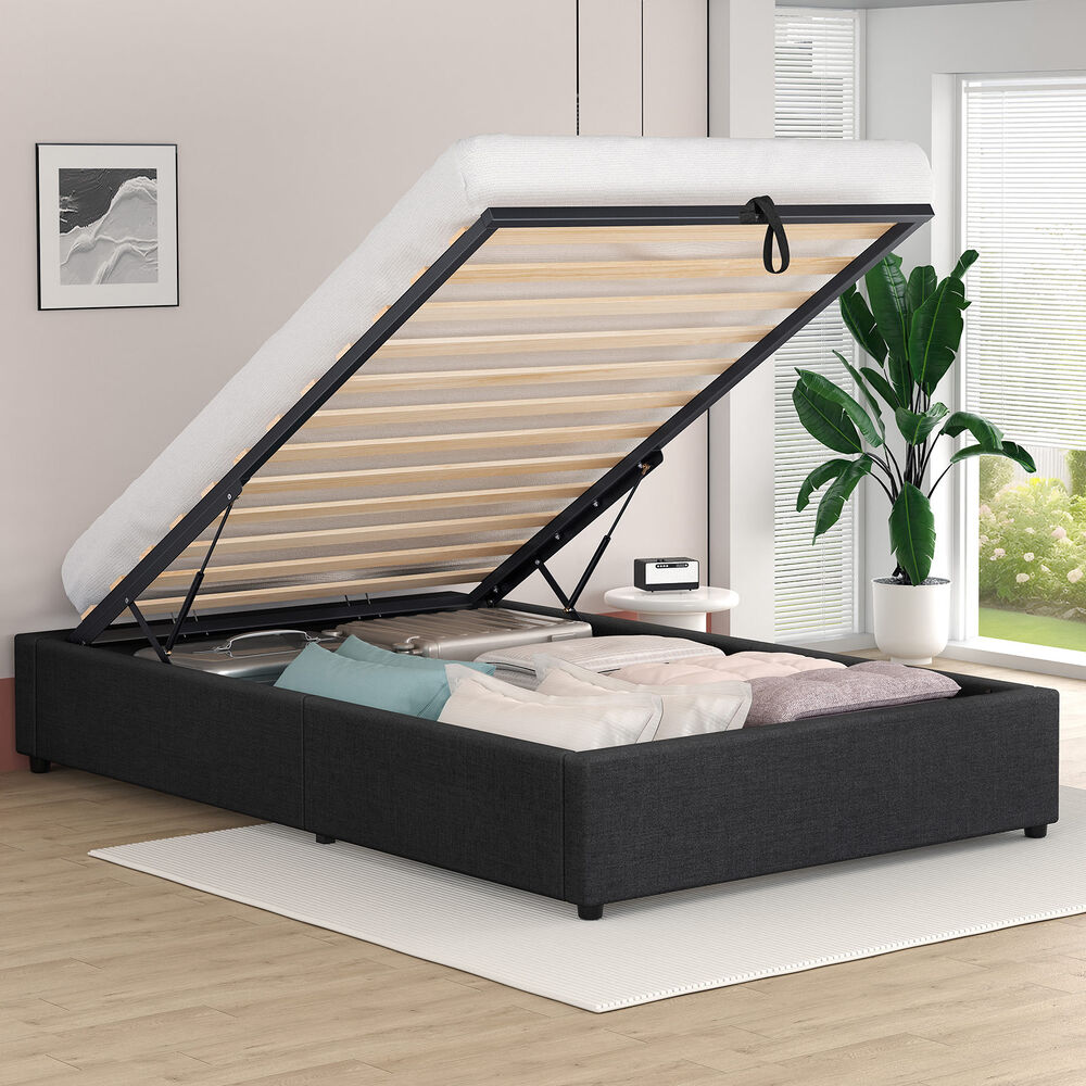 Quality counts - Constructed of durable wood slats and reinforced with exclusive X-support frame, this bed frame provides you with full sense of security. The heavy-duty gas lift mechanism allows you to effortlessly raise the mattress platform, providing easy access to the storage compartment. What's more, with adhesive Velcro strips, you can just lay the slats down, without inserting slats one by one at both end caps. Enjoy hassle-free installation!