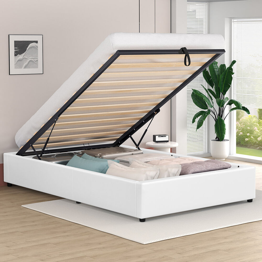Quality counts - Constructed of durable wood slats and reinforced with exclusive X-support frame, this bed frame provides you with full sense of security. The heavy-duty gas lift mechanism allows you to effortlessly raise the mattress platform, providing easy access to the storage compartment. What's more, with adhesive Velcro strips, you can just lay the slats down, without inserting slats one by one at both end caps. Enjoy hassle-free installation!