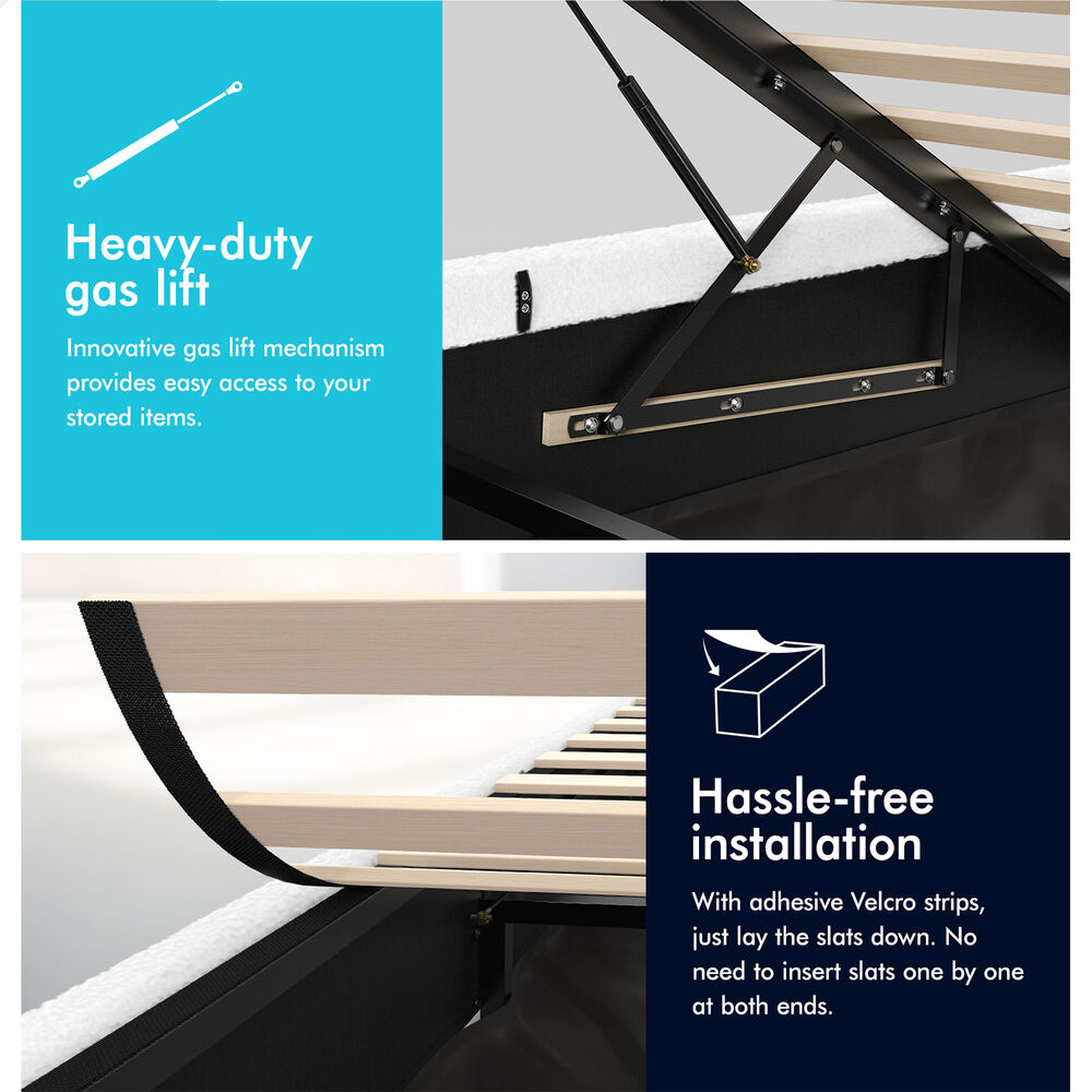 Quality counts - Constructed of durable wood slats and reinforced with exclusive X-support frame, this bed frame provides you with full sense of security. The heavy-duty gas lift mechanism allows you to effortlessly raise the mattress platform, providing easy access to the storage compartment. What's more, with adhesive Velcro strips, you can just lay the slats down, without inserting slats one by one at both end caps. Enjoy hassle-free installation!