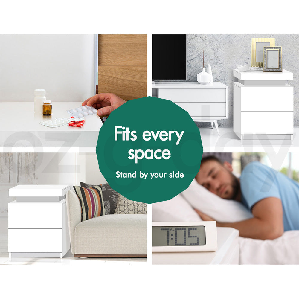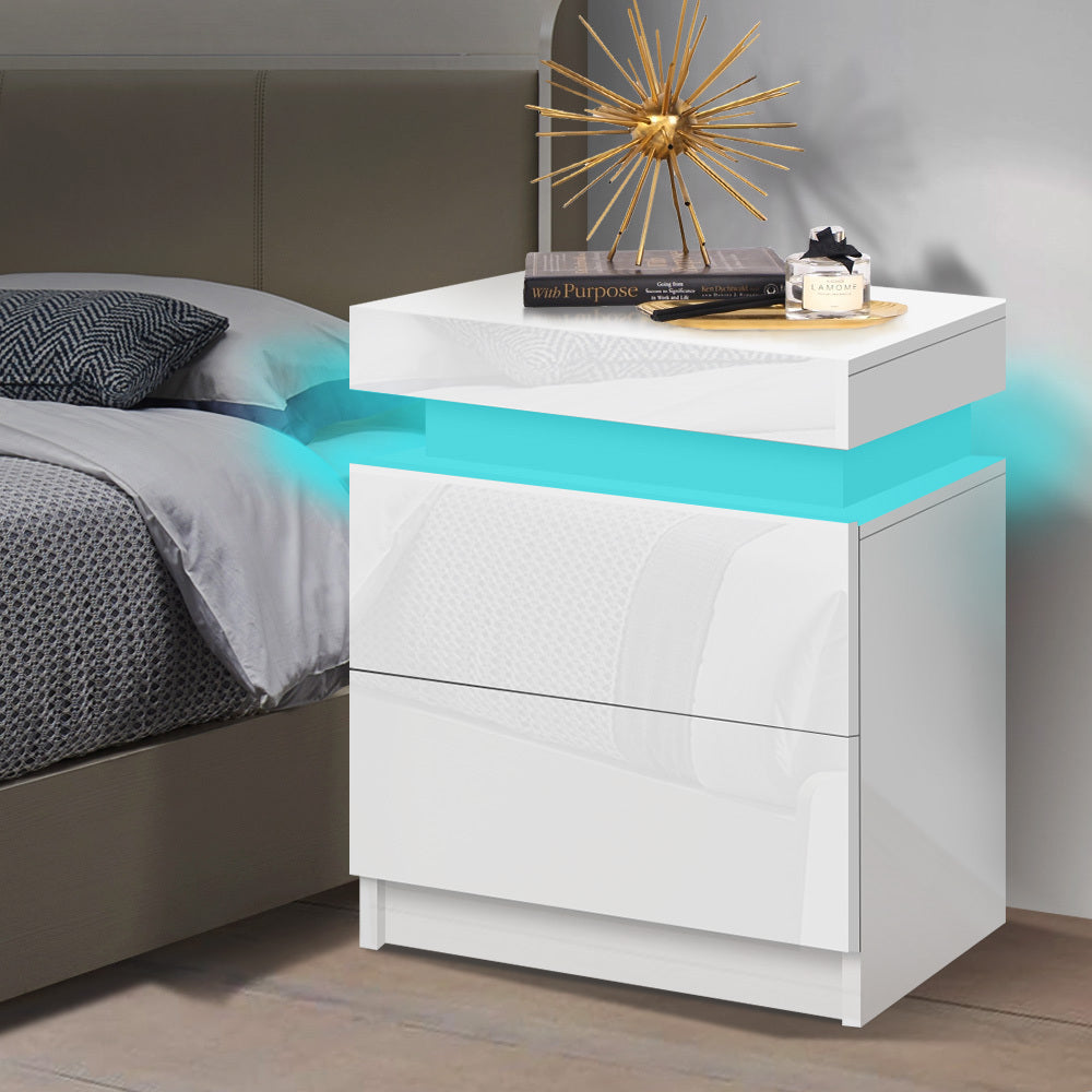 ALFORDSON Bedside Table RGB LED Nightstand 2 Drawers 4 Side High Gloss White