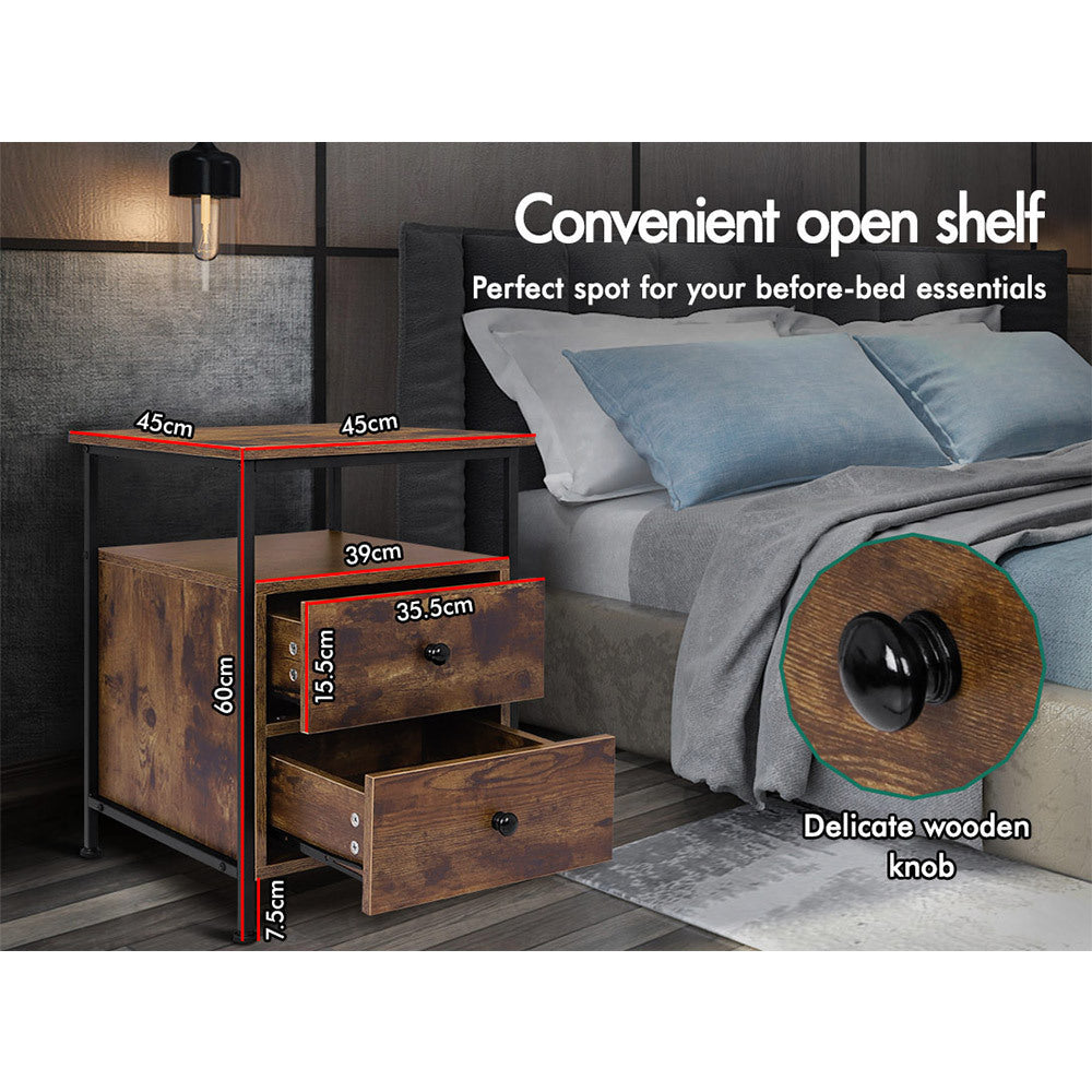 The bedside table can serve as a functional addition at the side of your bed. It provides a surface to place necessary items like a lamp, a laptop, a book, a glass of water, medicine or vitamin pills, or whatever else you may want to keep close by the bed. It also features a open shelf, which provides the perfect spot to slot your latest read, tablet or magazines. Not least, featuring 2 spacious drawers, it provides ample storage so that those items you store away in the drawers won't gather dust.