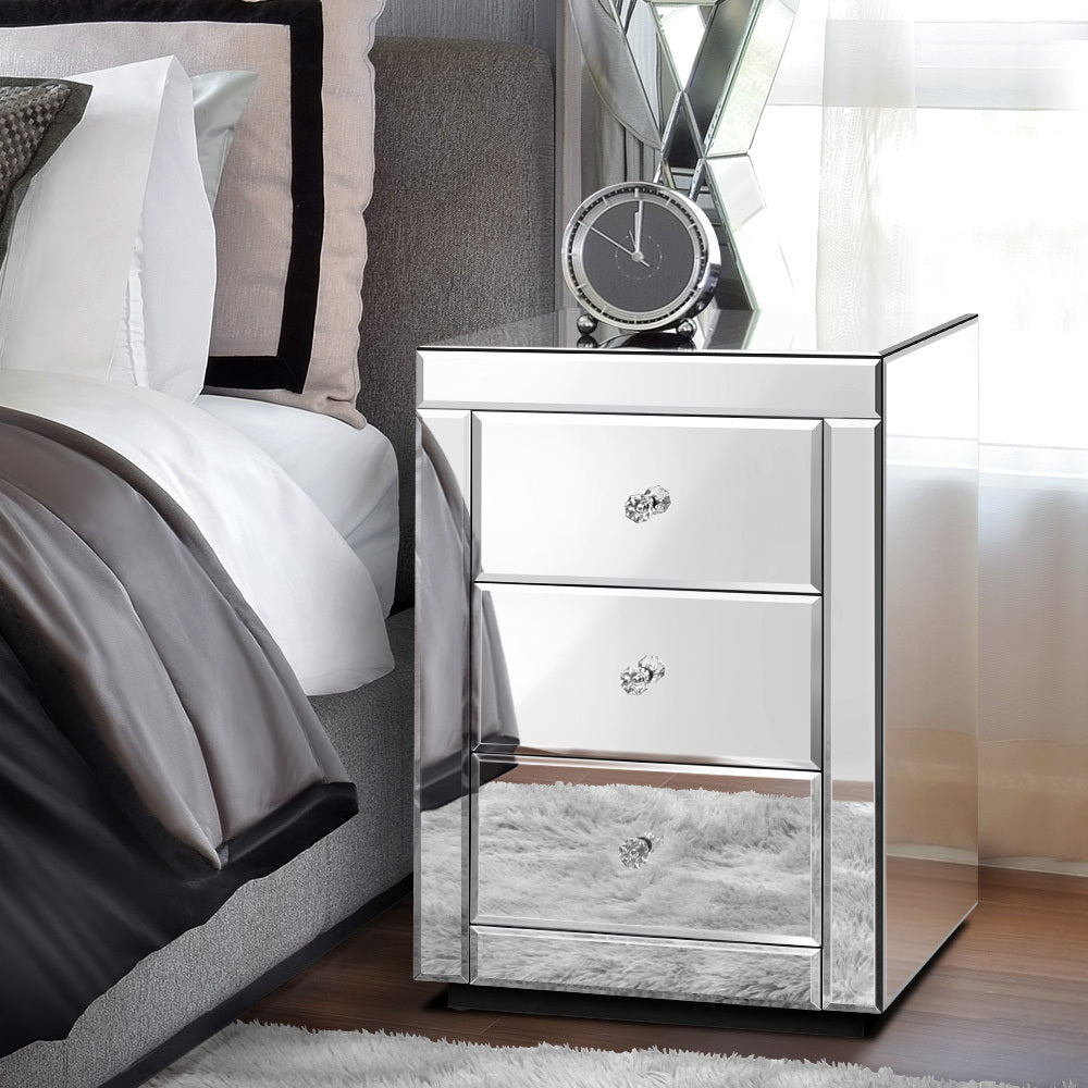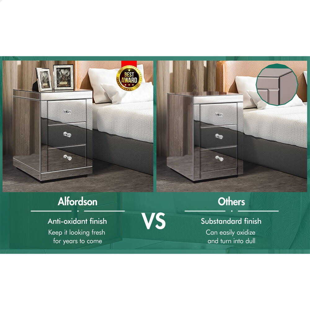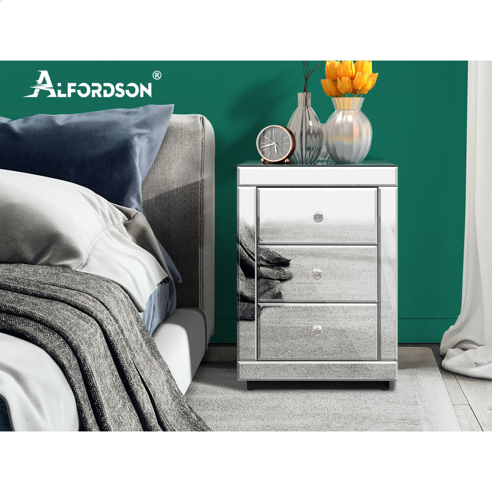 ALFORDSON Mirrored Bedside Table 3 Drawers Silver