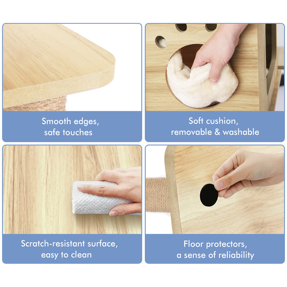 Constructed of solid and sustainably sourced wood, BEASTIE cat tree has a sturdy structure that will last for years to come. It is designed to offer multiple large platforms for kitties to climb, hide, relax and play on. Your kitties will love the fun that is available from different spots.