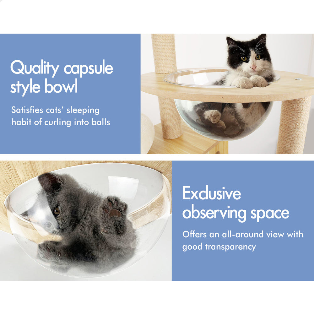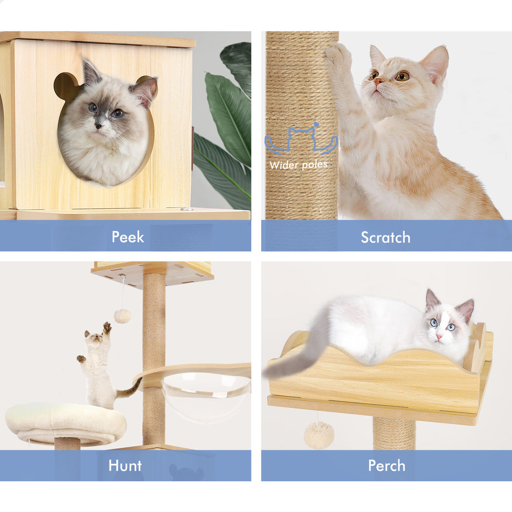 Better still, a cosy condo, a high-quality see-through bowl, large plush dens and dangly balls keep them entertained when they are alone. It also comes with sisal scratching poles for cute climbers to develop healthy nails.