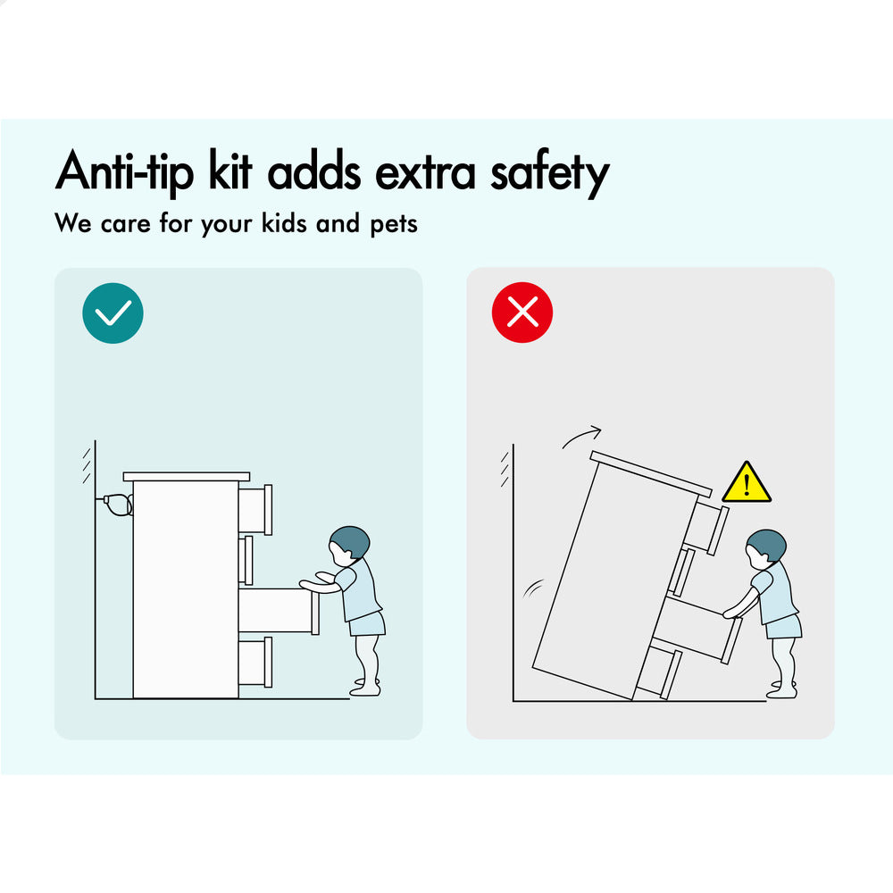 Made of superior E1 grade and 15mm thick particle board, this chest of drawers is designed to be highly secure. To add extra stability, an upgraded anti-tip kit is equipped for the linkage between the cabinet and the wall. Unlike some other sellers, we have no compromise on materials used. Instead of flimsy paper finish, our chest of drawers is well made with melamine finish. It is not only easy to maintain, but also long lasting.