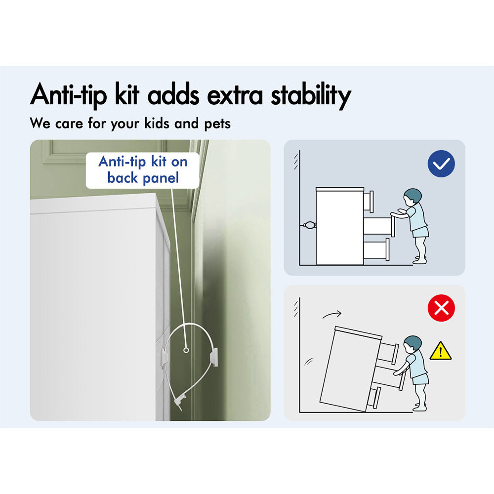 Made of superior E1 grade and 15mm thick particle board, this chest of drawers is designed to be highly secure. To add extra stability, an upgraded anti-tip kit is equipped for the linkage between the cabinet and the wall. Unlike some other sellers, we have no compromise on materials used. Instead of flimsy paper finish, our chest of drawers is well made with melamine finish. It is not only easy to maintain, but also long lasting.