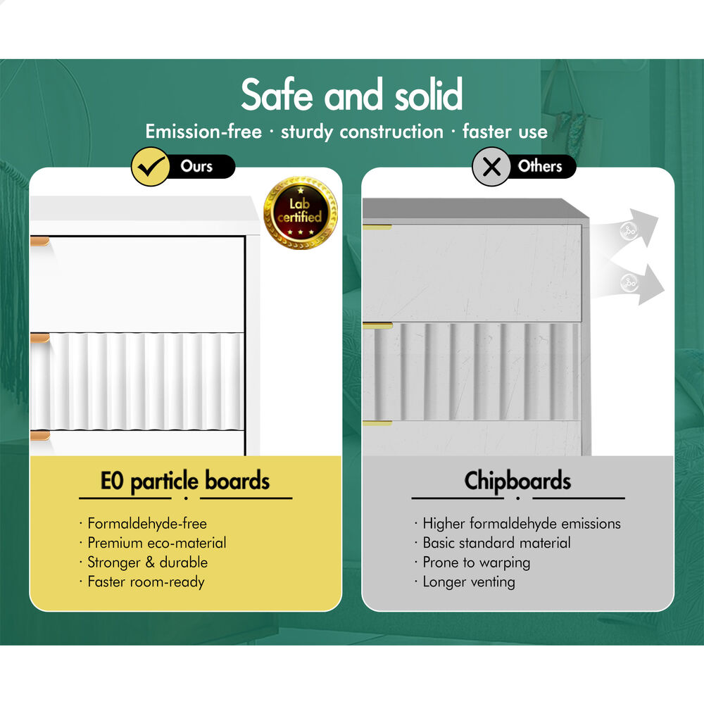 Made of superior E1 grade 15mm thick particle board, this chest of drawers is designed to be highly secure. To add extra stability, an upgraded anti-tip kit is equipped for the linkage between the cabinet and the wall. Unlike some other sellers, we have no compromise on materials used. Instead of flimsy paper finish, our chest of drawers is well made with melamine finish. It is not only easy to maintain, but also long lasting.