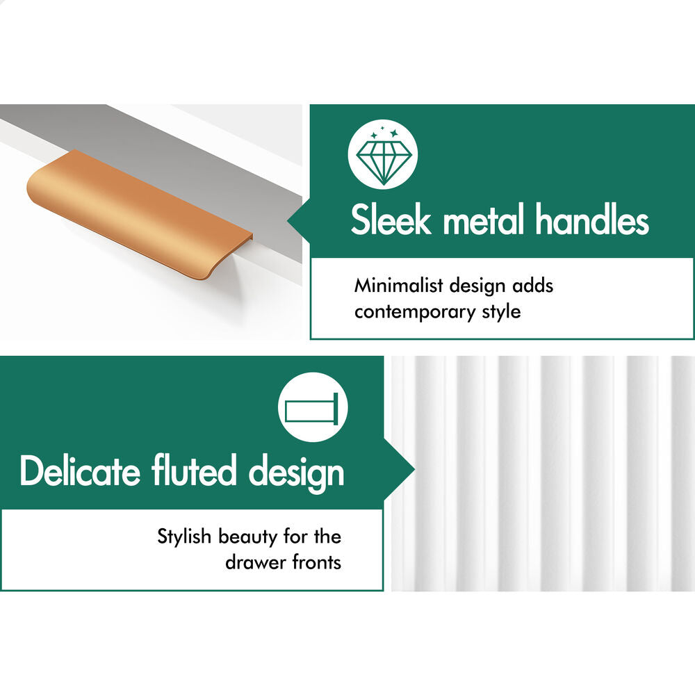 Crafted with minimalist elegance, this chest of drawers blends clean lines and delicate fluted design, making it a seamless fit for any space regardless of the style of your home. More than just a chest of drawers, it doubles as a chic bedroom tallboy or a functional hallway dresser, adding a touch of sophistication wherever it goes.