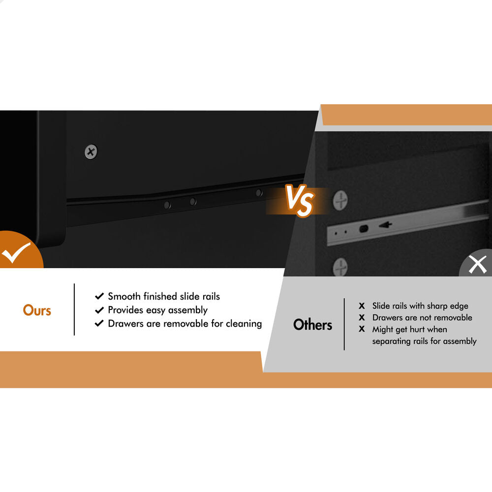 Made of superior E1 grade particle board, this chest of drawers is designed to be highly secure. To add extra stability, an upgraded anti-tip kit is equipped for the linkage between the cabinet and the wall. Unlike some other sellers, we have no compromise on materials used. Instead of flimsy paper finish, our chest of drawers is well made with melamine finish. It is not only easy to maintain, but also long lasting.