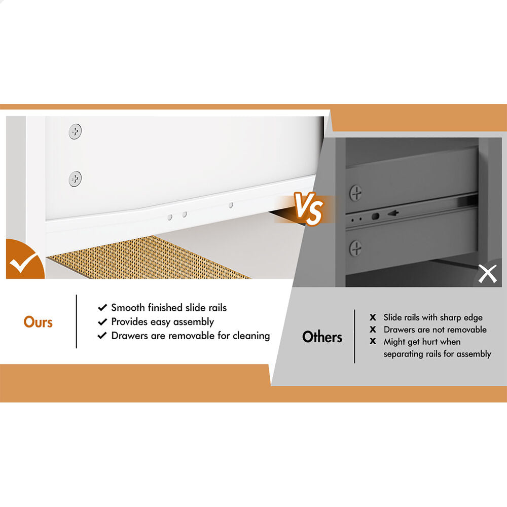Made of superior E1 grade thick particle board, this chest of drawers is designed to be highly secure. To add extra stability, an upgraded anti-tip kit is equipped for the linkage between the cabinet and the wall. Unlike some other sellers, we have no compromise on materials used. Instead of flimsy paper finish, our chest of drawers is well made with melamine finish. It is not only easy to maintain, but also long lasting. Equipped with solid wooden legs, this storage cabinet effortlessly supports heavy loads with unwavering stability.