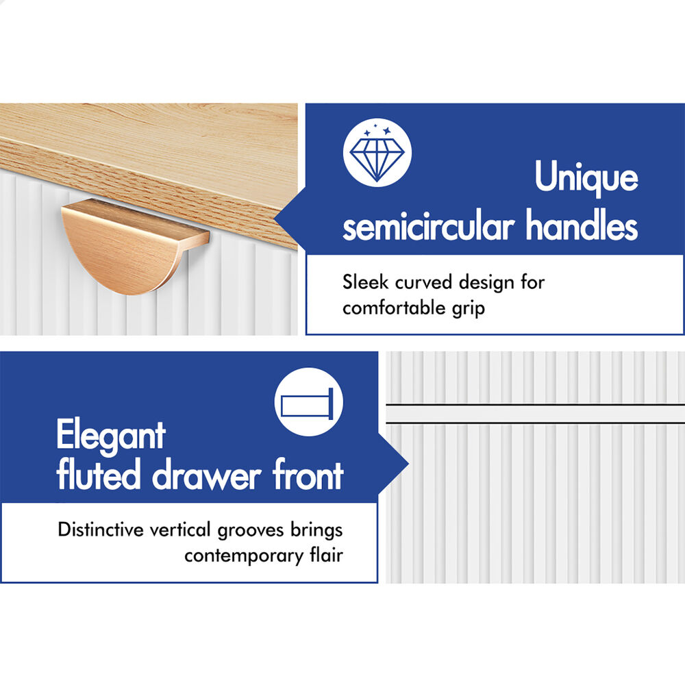 Crafted with luxury elegance, this chest of drawers blends unique fluted design and clean lines, making it a seamless fit for any space regardless of the style of your home. More than just a chest of drawers, it doubles as a chic bedroom tallboy or a functional hallway dresser, adding a touch of sophistication wherever it goes.