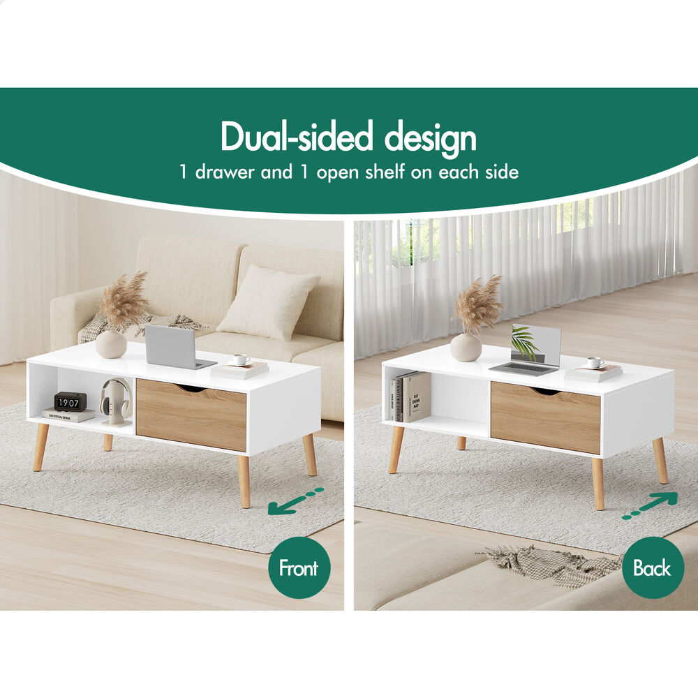 Along with enhancing the aesthetic of the space, this coffee table provides ample storage option for daily essentials. The wide tabletop is just the right place for tissue box, drinks, remote controls and home decor. Featuring 2 ample drawers and 2 open shelves on both front and back sides, it offers a discreet way to store items like magazines, books or devices, while the shelves are additional storage for items easily accessible.