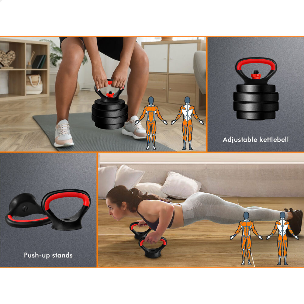 The evolutionary design offers you seven combinations weight plates, dumbbells, barbell, kettlebell, two-handle kettlebell, macebell and push up stands, allowing you to achieve full-body strength conditioning, endurance training, balance and flexibility training. Its versatility maximally fulfills your workout routine.