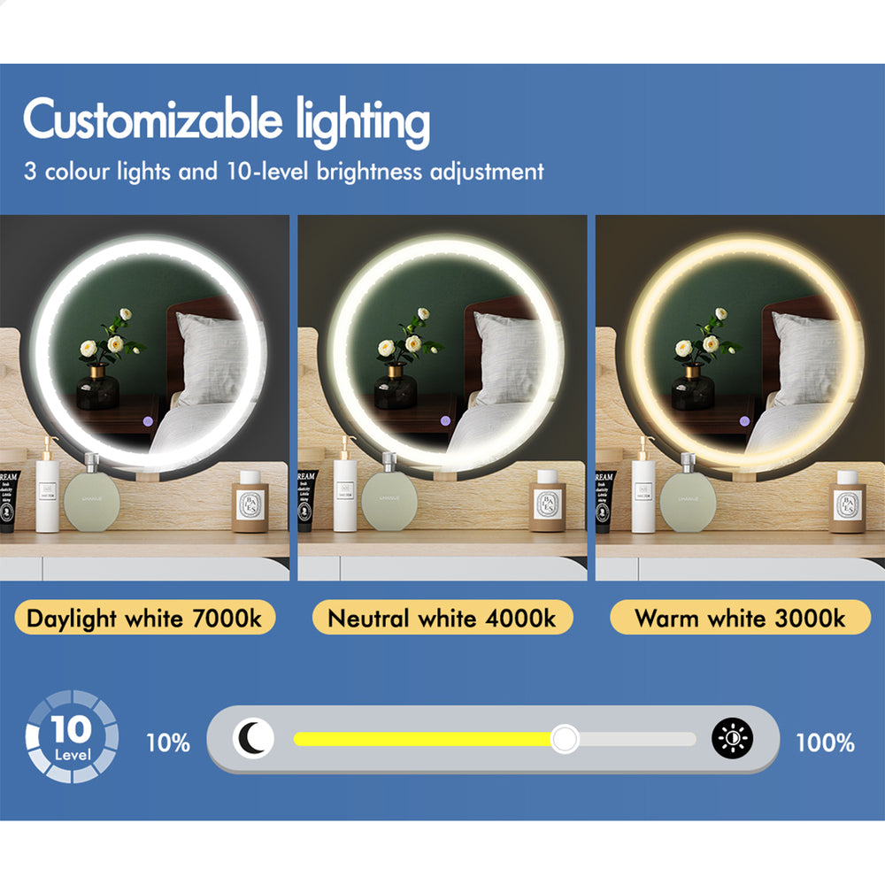 Customizable lighting - Good lighting is important to achieve your perfect glam look. The dressing table features 3 LED light colours - neutral white, warm white, and daylight white and the brightness of each colour can be adjusted in 10 levels, providing adequate light to complete your make-up.