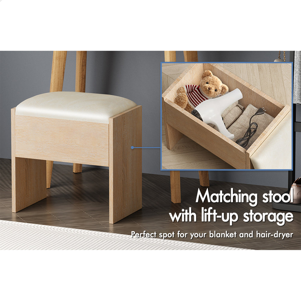 Comes with matching chair - The matching upholstered stool will provide you with a comfortable sitting position while applying make-up. Furthermore, the chair comes with lift-up lid for easy storage, which is a perfect spot for your blanket or hair-dryer.