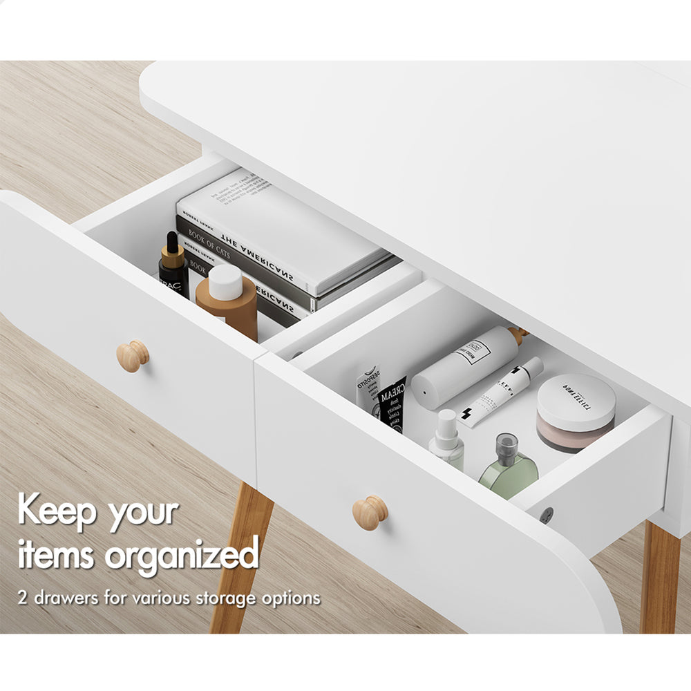 Keep your items organized - It features 2 drawers and multiple shelves to organize your personal items. For items you want to access easily, like make-up products, lotions, or perfumes, you can simply put them on desktop of table. For other items, like jewellery, you can store them away in drawers so they won't gather dust.