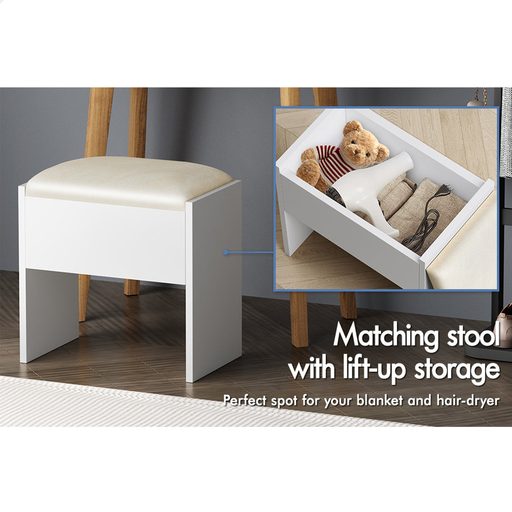 Comes with matching chair - The matching upholstered stool will provide you with a comfortable sitting position while applying make-up. Furthermore, the chair comes with lift-up lid for easy storage, which is a perfect spot for your blanket or hair-dryer.