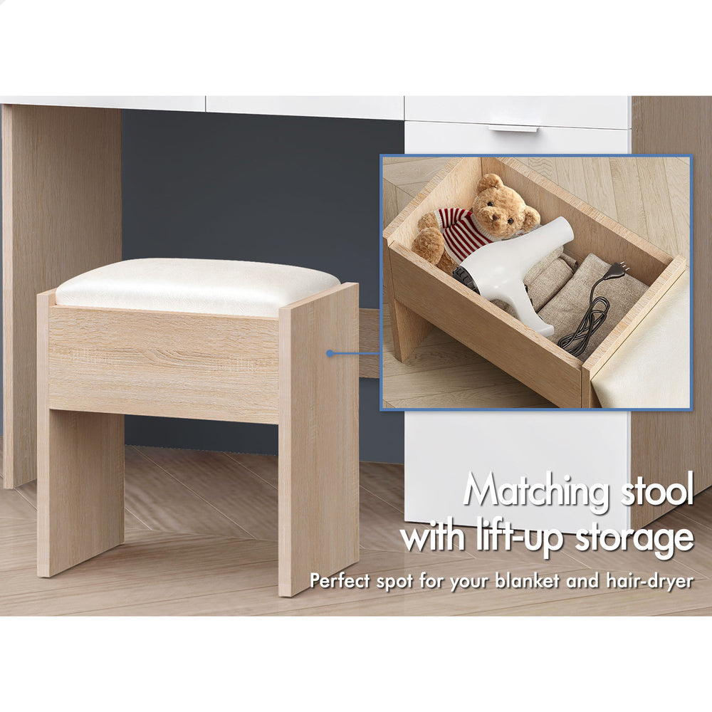 Comes with matching chair - The matching upholstered stool will provide you with a comfortable sitting position while applying make-up. Furthermore, the chair comes with lift-up lid for easy storage, which is a perfect spot for your blanket or hair-dryer.
