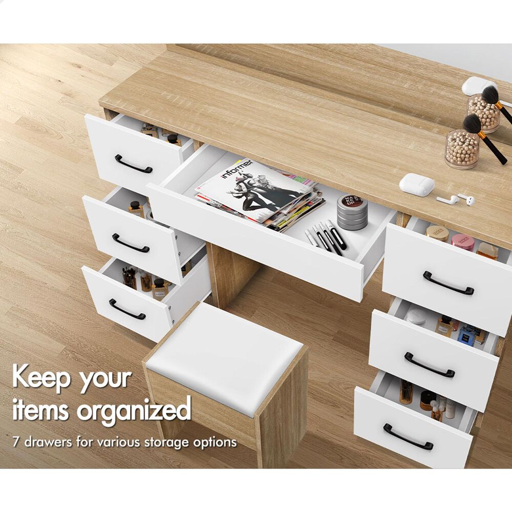 Keep your items organized - It features 7 drawers in different sizes for various storage options. For items you want to access easily, like make-up products, lotions, or perfumes, you can simply put them on desktop of table. For other items, like jewellery, you can store them away in drawers so they won't gather dust.