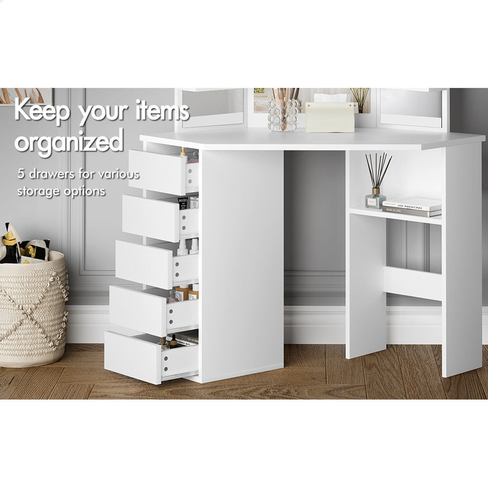 Keep your items organized - It features 5 drawers in different sizes and open shelves for various storage options. For items you want to access easily, like make-up products, lotions, or perfumes, you can simply put them on desktop of table. For other items, like jewellery, you can store them away in drawers so they won't gather dust.