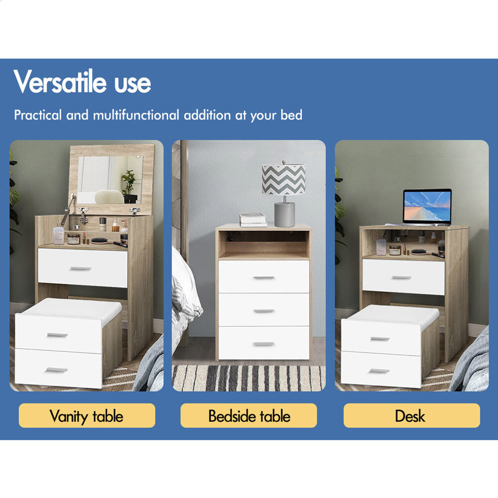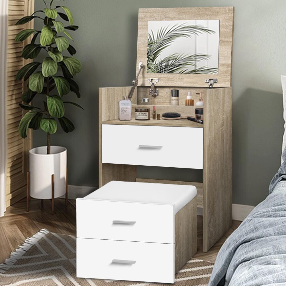 Upgraded all in one - With compact and space-saving design, this dressing table is ideally placed by the bed with multifunctional use. Accompanied with a flip-top mirror and a smooth sliding stool, it is a complete vanity table set for you to get ready your beauty routine. After closing the tabletop, it transforms into a writing desk. Furthermore, you can get a bedside table while the stool is hidden under the table.