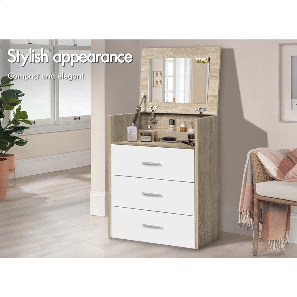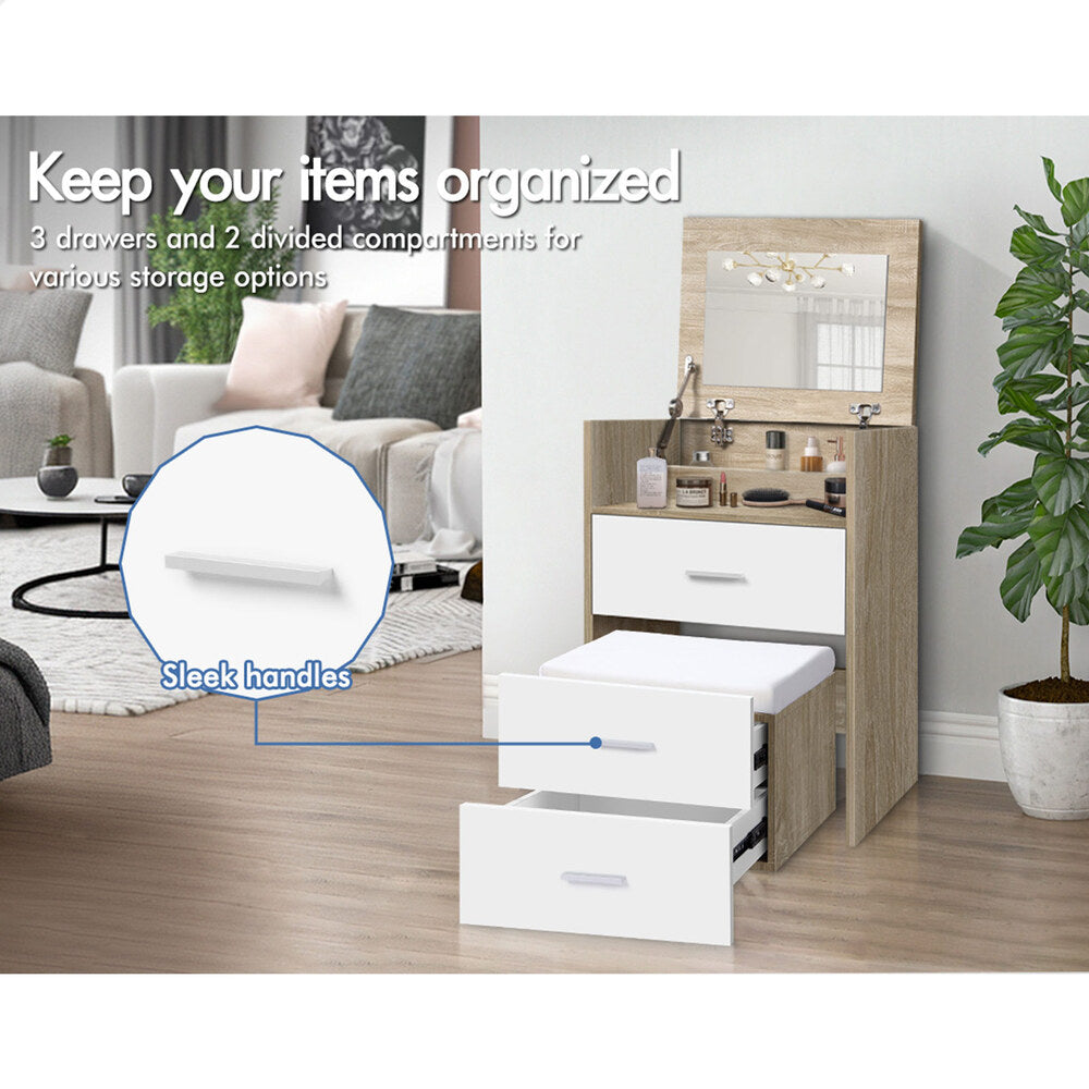 Keep your items organized - It features 3 drawers for ample storage space, which allows you to store the daily essentials, like make-up products, jewellery or hair-dryer. Featuring extra storage space, the divided compartments under the desktop can accommodate all sorts of items you want to access easily, such as lotions, perfumes or cosmetics.