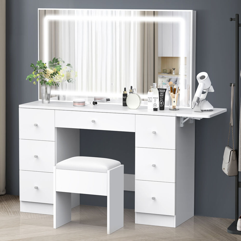 Keep your items organized - This dressing table features 7 drawers in different sizes for various storage options. For items you want to access easily, like make-up products, lotions, or perfumes, you can simply put them on desktop of table. For other items, like jewellery, you can store them away in drawers and cabinet so they won't gather dust. With remarkable convenience, there is a drop-leaf countertop which is easily extended for placing your hair-dryer or folded up when not in use, providing flexibility in your beauty routine.