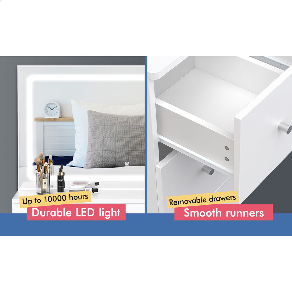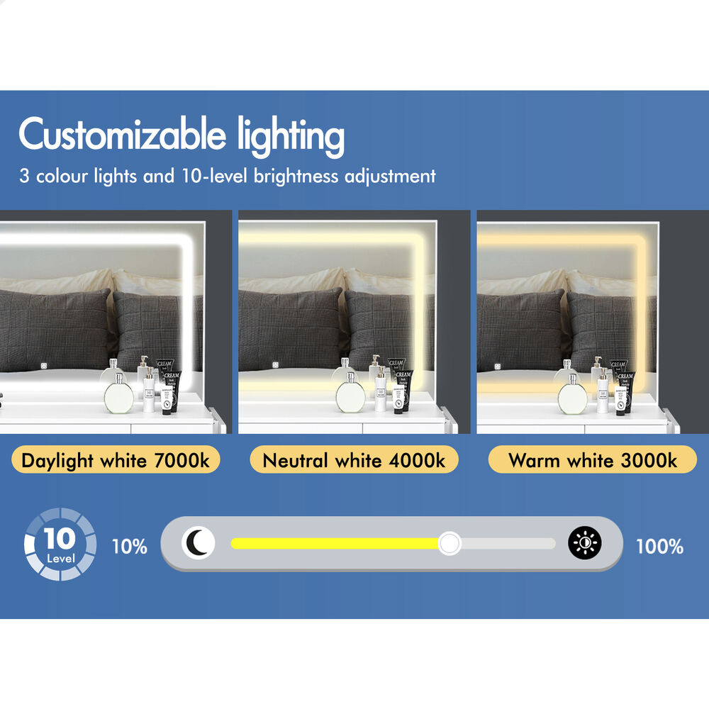 Customizable lighting - Good lighting is important to achieve your perfect glam look. The dressing table features 3 LED light colours - neutral white, warm white, and daylight white and the brightness of each colour can be adjusted in 10 levels, providing adequate light to complete your make-up.
