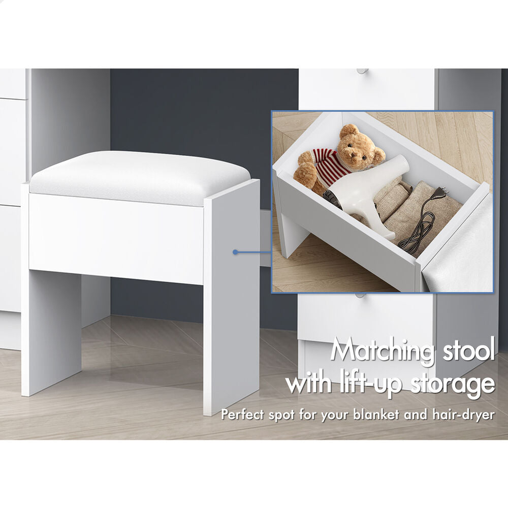 Comes with matching chair - The matching upholstered stool will provide you with a comfortable sitting position while applying make-up. Furthermore, the chair comes with lift-up lid for easy storage, which is a perfect spot for your blanket or any daily necessities.