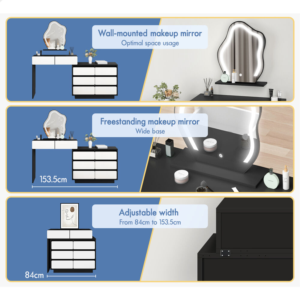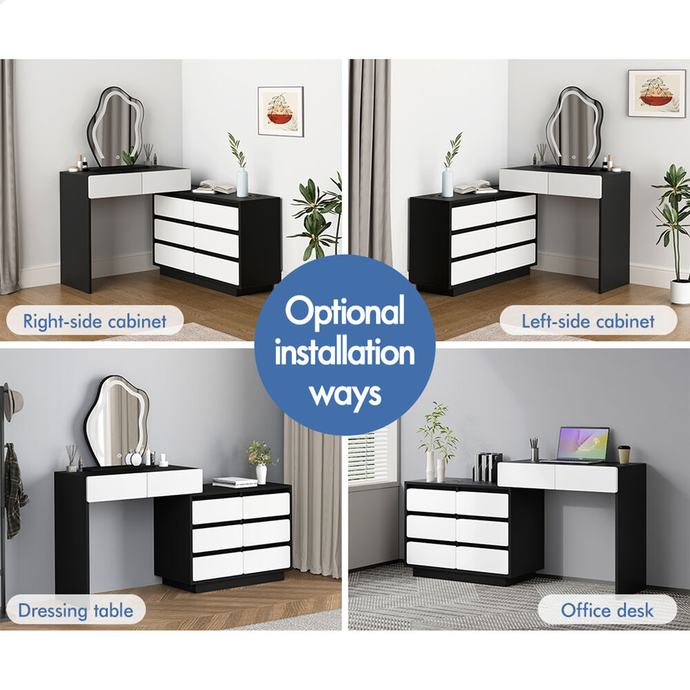 Adjustable side cabinet - With compact and flexible design, the dressing table features a movable 6-drawer chest which can be installed on the left or right side to meet your multiple placement needs. More importantly, it can be adjusted from 84cm to 153.5cm in width or placed in 90 degrees to fit in corner, making it possible to fully utilize room space.