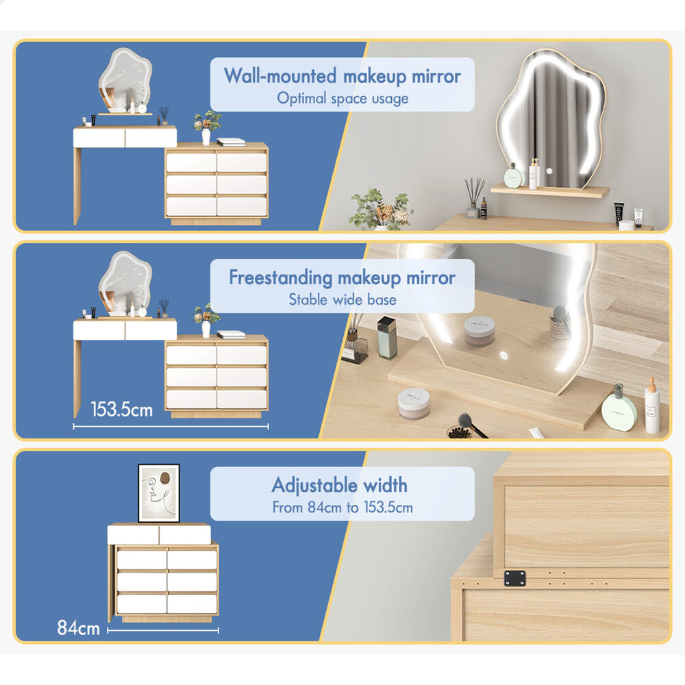 Adjustable side cabinet - With compact and flexible design, the dressing table features a movable 6-drawer chest which can be installed on the left or right side to meet your multiple placement needs. More importantly, it can be adjusted from 84cm to 153.5cm in width or placed in 90 degrees to fit in corner, making it possible to fully utilize room space.