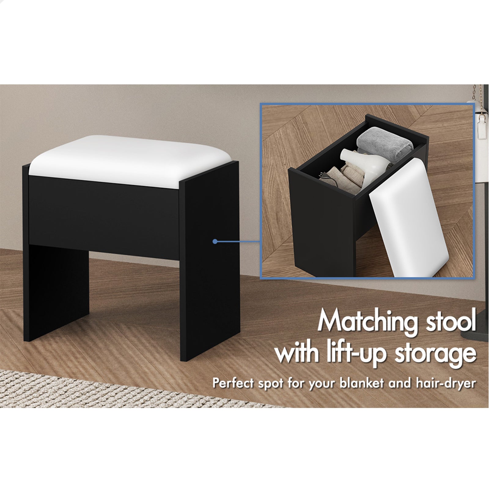Comes with matching chair - The matching upholstered stool will provide you with a comfortable sitting position while applying make-up. Furthermore, with lift-up lid for easy storage, it is a perfect spot for your blanket or hair-dryer.