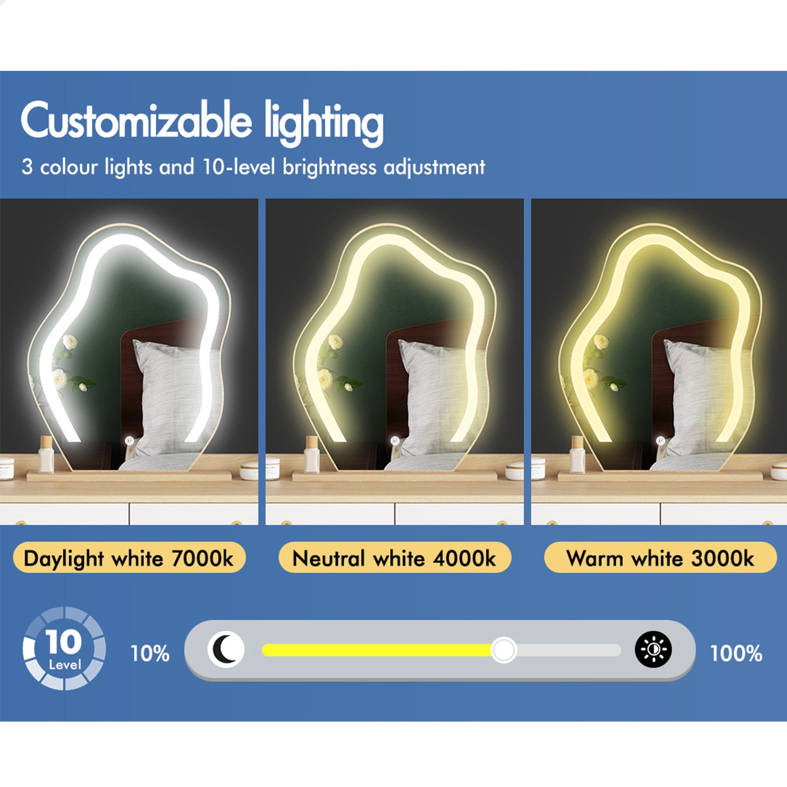 Customizable lighting - The dressing table features 3 LED light colours - neutral white, warm white, and daylight white and the brightness of each colour can be adjusted in 10 levels, providing adequate light to complete your make-up.